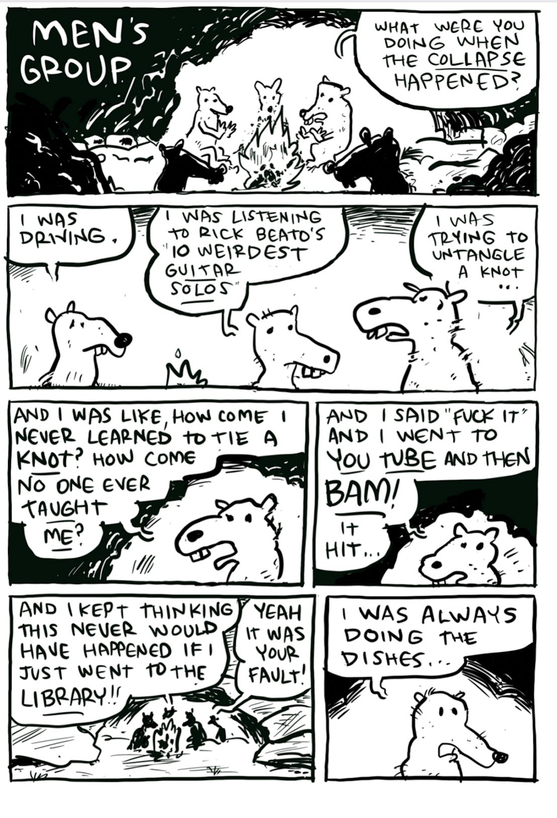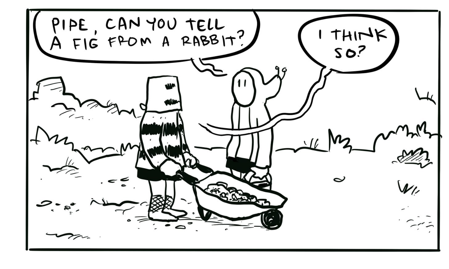 Tom shows his examples from his comic in progress where the boys are wear buckets on their heads, the girls hide in hoodies, and the men are all rats. So everyone looks the same! How do you get out of it? Tom and Jess talk about it.