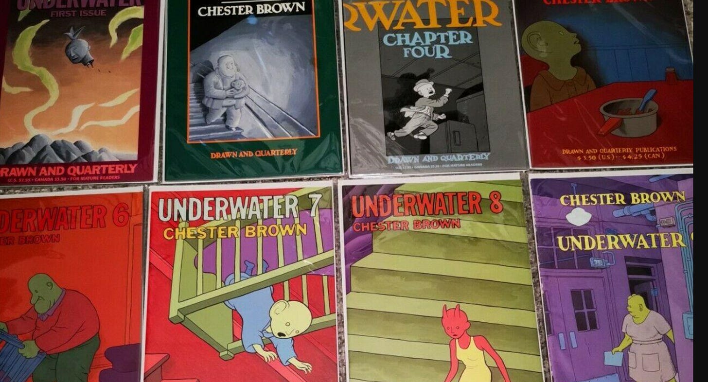 We talked briefly about Chester Brown’s Underwater. Tired of drawing hair, Brown drew everyone bald, which is fine. He also wanted to draw out the lengthy mental/sensory development of an infant into childhood and adulthood. He later abandoned the project! Terrible Commitment or brave experiment, or both?!